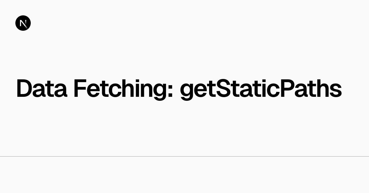 // pages/[slug].js // ... export async function getStaticPaths() { const paths = [{ params: { id: "1" } }, { params: { id: "2" } }]; return { paths, fallback: false }; }